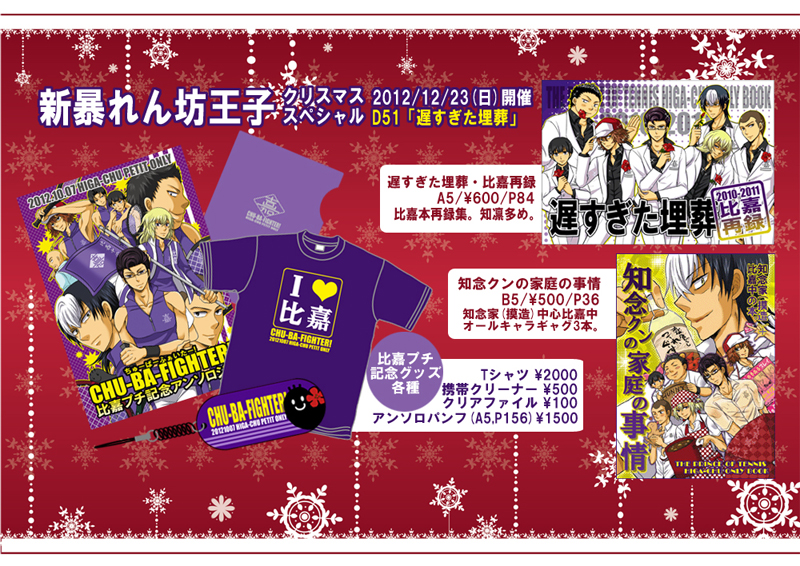D-51「遅すぎた埋葬」でひっそりスペースとって 既刊とアンソログッズ販売いたします~! 新刊無しの予定なんですが、間に合えばクリスマスぽい ちねりん漫画の無料配布考えてます。 今回は目の不調もあり、完成できるかわからないので どうなるかは全日にでもこちらのブログチェックしてやってください 不甲斐なくてすいません_(:3」∠)_